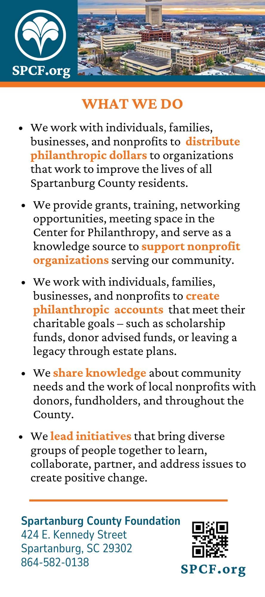 To everyone who has given or plans to contribute to the Spartanburg Community Fund: Thank you! Your trust and generosity empower us to continue improving lives across Spartanburg County. Together, we are improving the lives of all Spartanburg County residents by building a stronger community for generations to come.